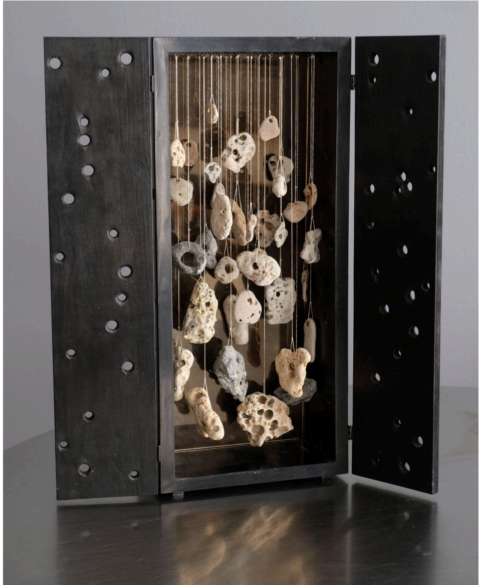“We are born into landscapes of chance. Charcoal powder and water, onto raw canvas, obey only gravity and grain. They pool and bleed – not as renderings, but as records: maps of accident, memory, and erosion. This is the unstable ground we exist in: gritty, porous, unpredictable – the very texture of a lived life. Into this terrain, I push a needle, pulling a red thread.” –Bren West