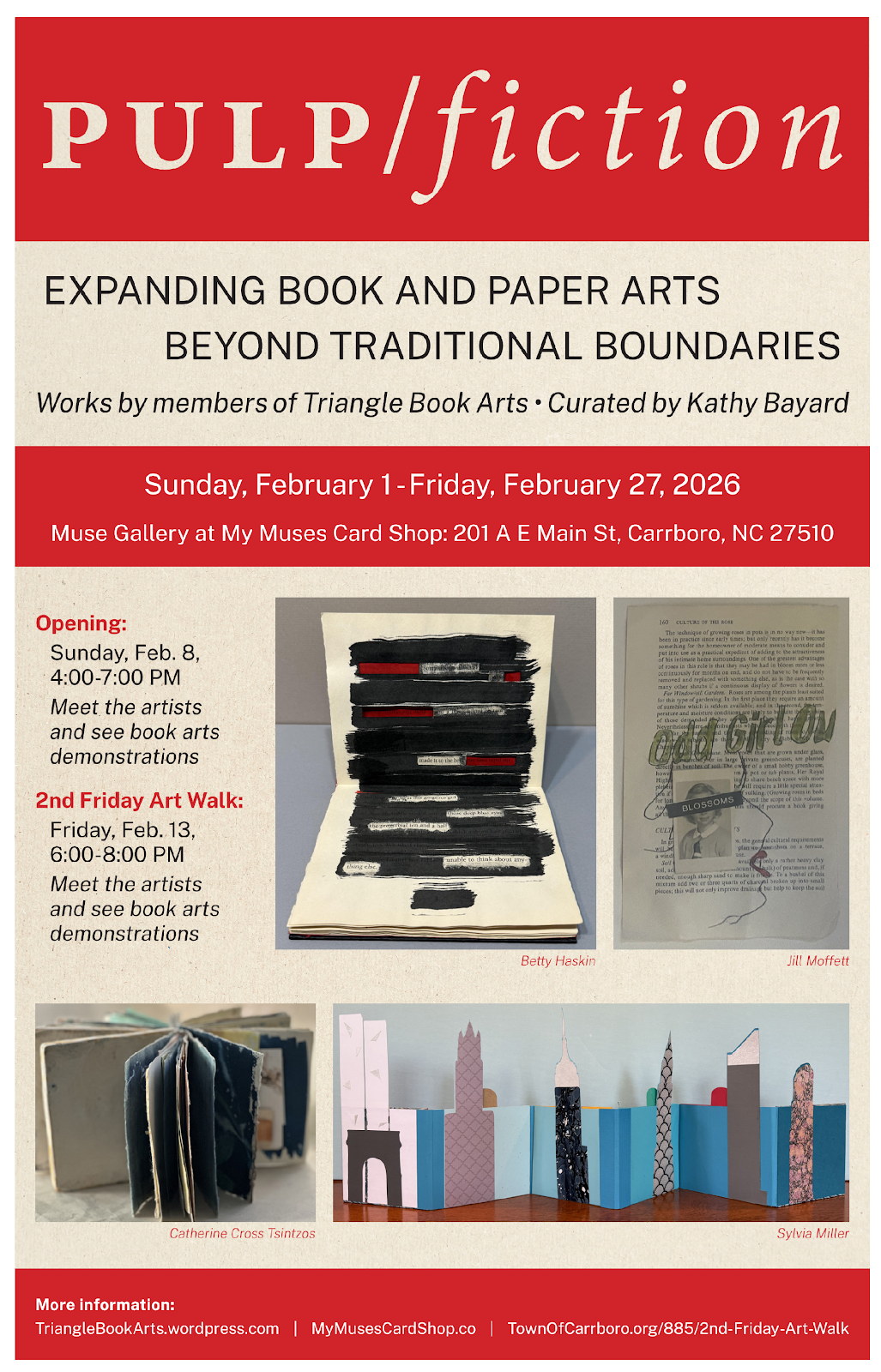 “Triangle Book Arts is made up of book artists, bookbinders, printmakers, calligraphers, papermakers, photographers, zinemakers, collage artists, and paper artists. This exhibit features book and paper art exploring paper pulp, the Pulp Fiction genre, altered books, storytelling, paper weaving and creative bookbinding. Each art piece pushes the boundaries of book art and how one envisions books, stories and paper.”— Muse Gallery