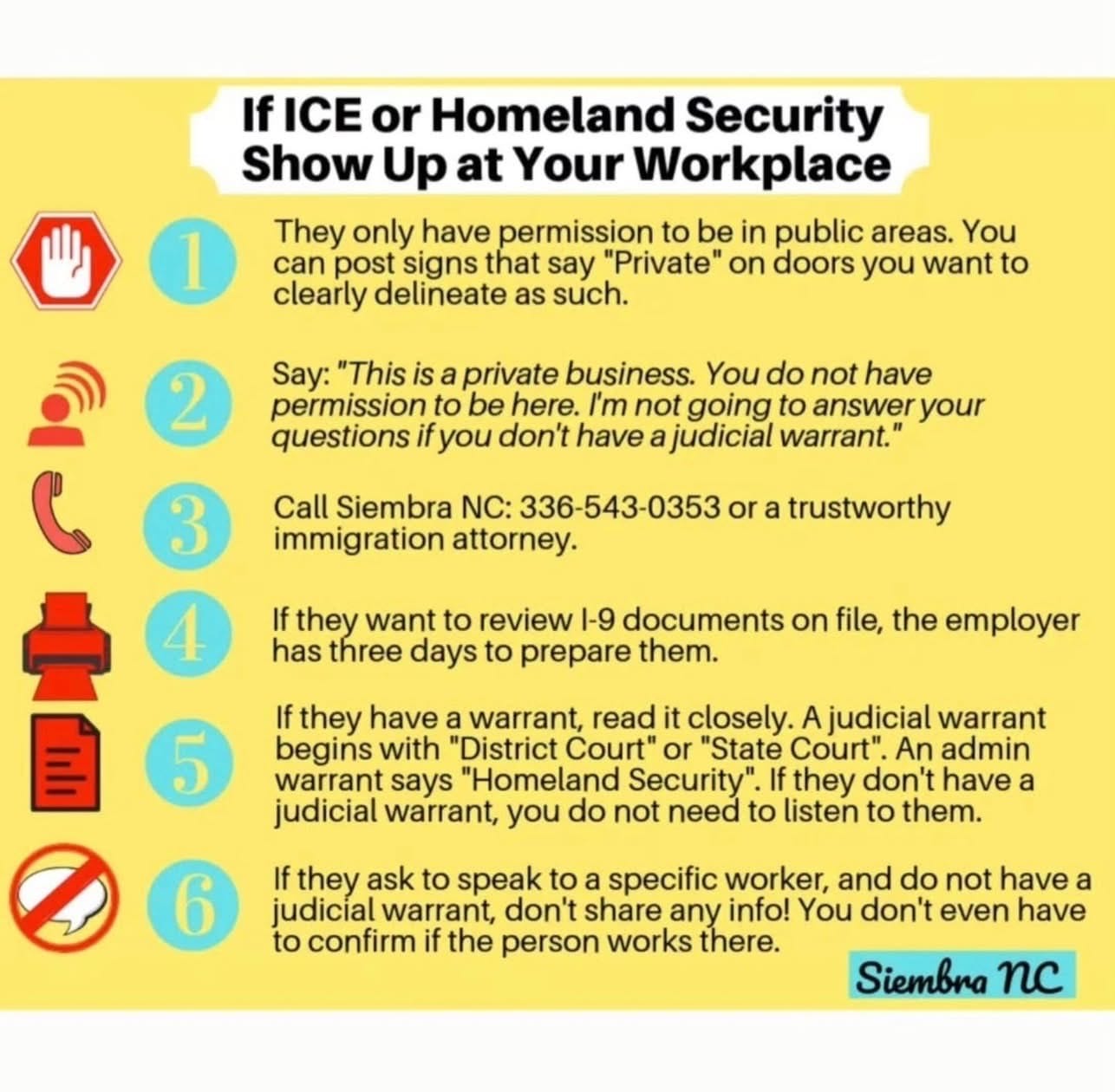 Siembra NC created a toolkit to help businesses protect themselves and their employees. They define a 4th Amendment Workplace as one that: 1) Knows ICE needs a judicial warrant (not administrative) to enter private areas; 2) Trains staff to assert their constitutional rights during search & seizure operations; 3) Protects all workers, regardless of immigration status.