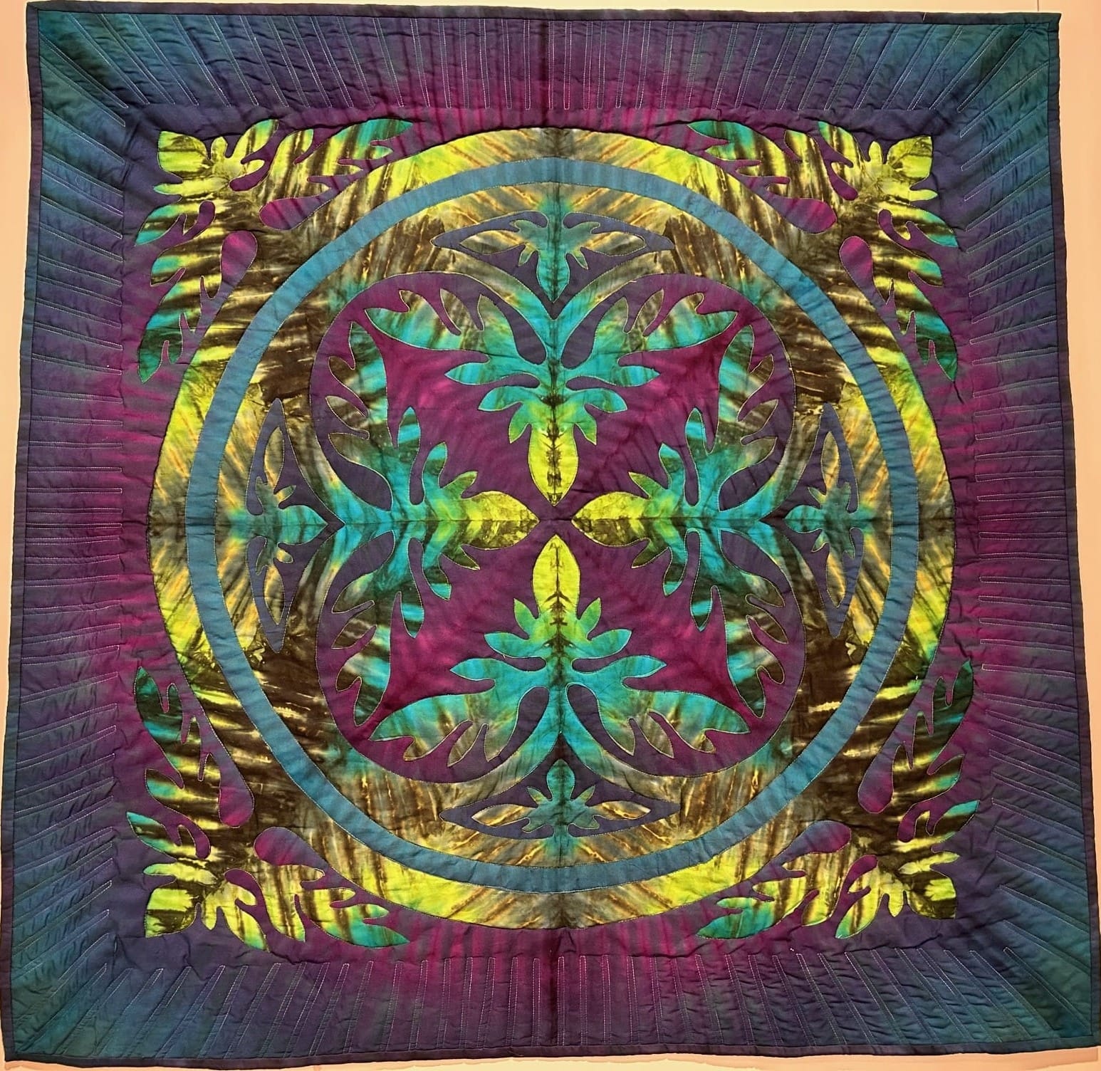 She described a recent "breakthrough" in developing her skills to make curves in her pieces, as in Hawaiian Vibes, employing a different technique than what she uses for the more linear designs. Here, she showed me that the fabric comprising the circle is folded under and stitched to the background, resulting in a design with organic flow.