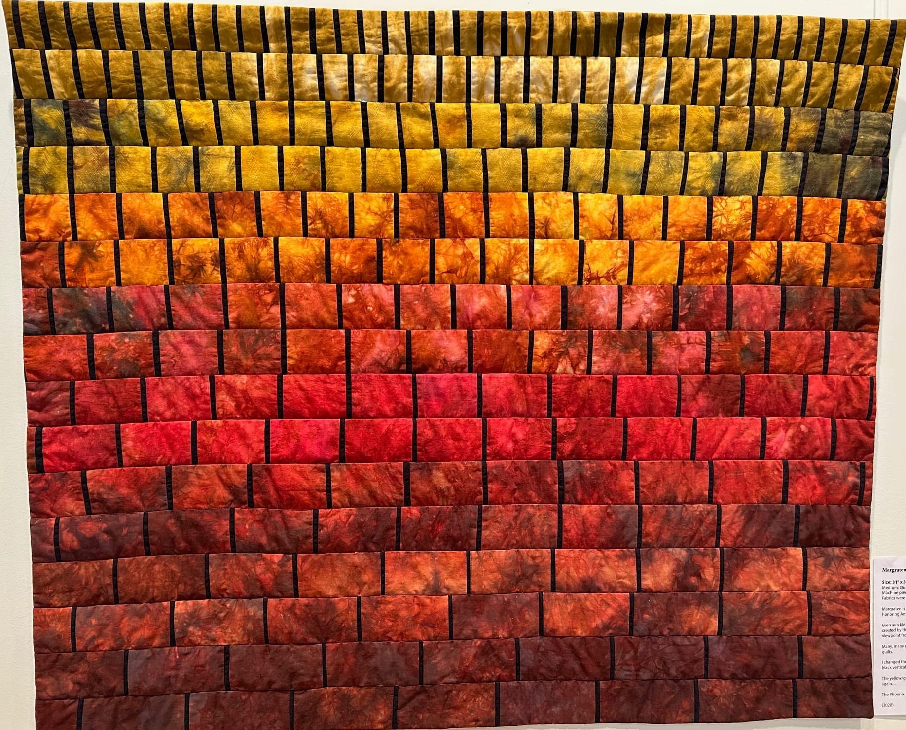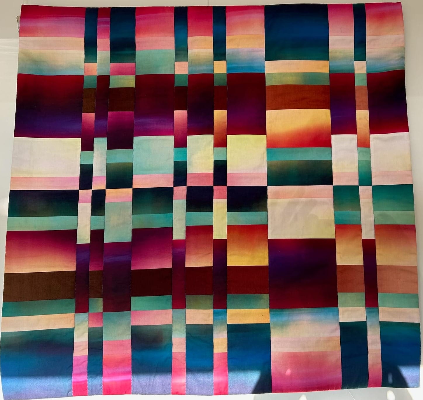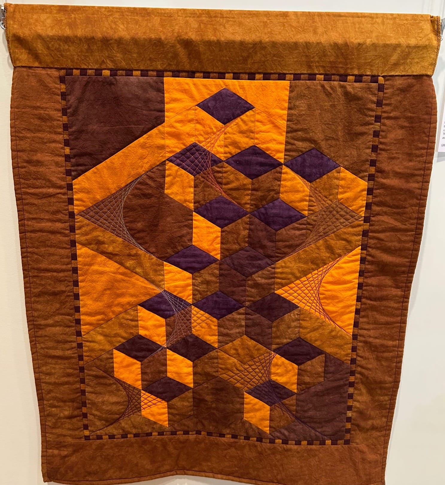 Most of her quilts on display feature mathematical or geometric designs. She is comfortable with straight lines and a disciplined form. But what makes these works pop is the bold color palette that infuses energy into the organization of each piece.