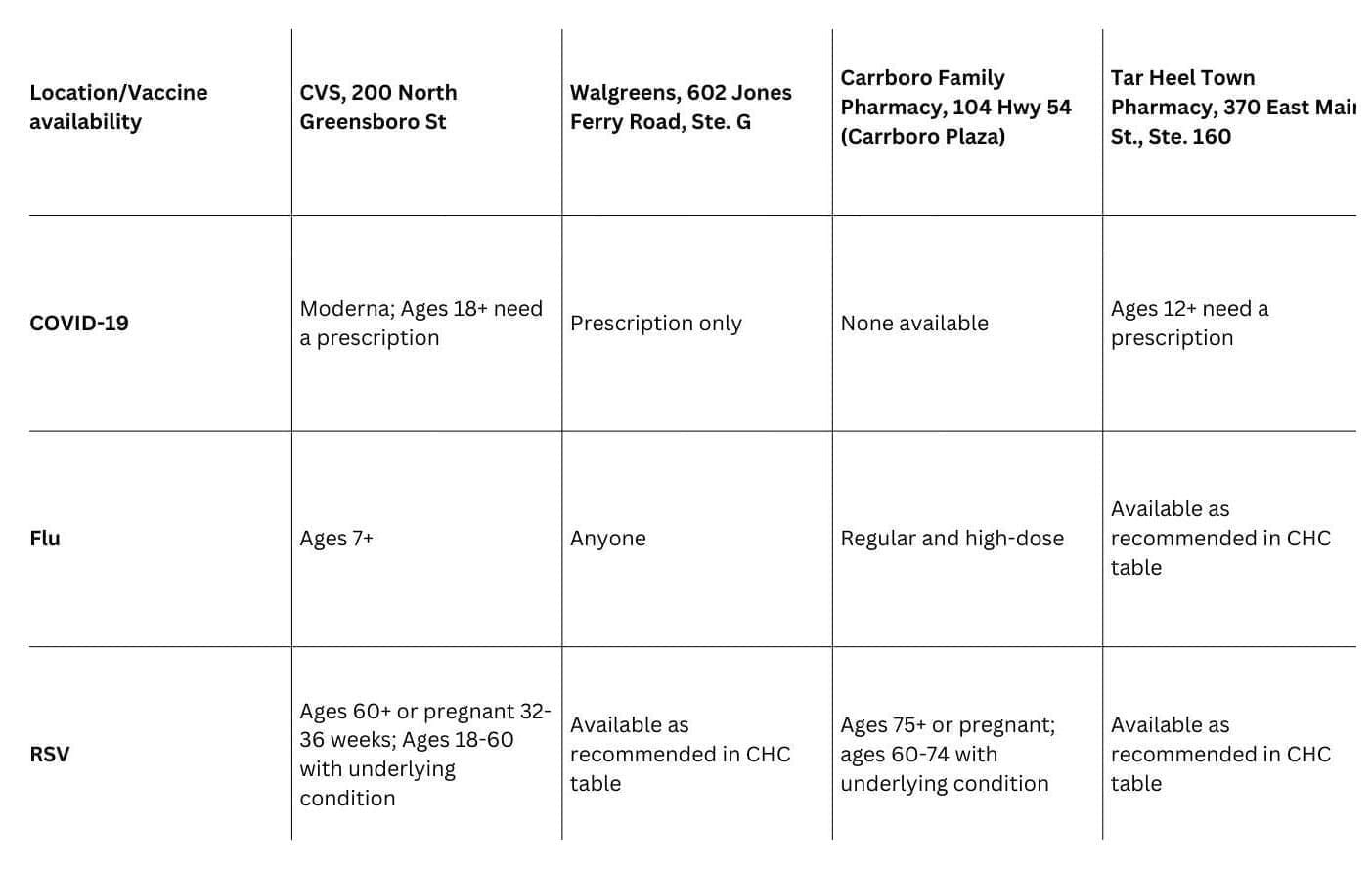 The Carrborean visited four pharmacies in Carrboro September 10 to assess vaccine availability and accessibility. You can see differences among these pharmacies in the table below. If there are differences in one small town, what are the implications statewide and nationwide for a public health strategy that depends on widespread service utilization to reduce disease transmission?