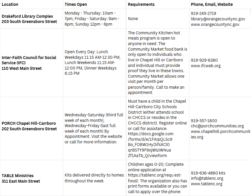 Orange County advises SNAP recipients to plan ahead and "prioritize essential grocery items." OC Social Services and the NC Cooperative Extension are working with organizations to "plan for increased demand." They published a list of places to find food (below).