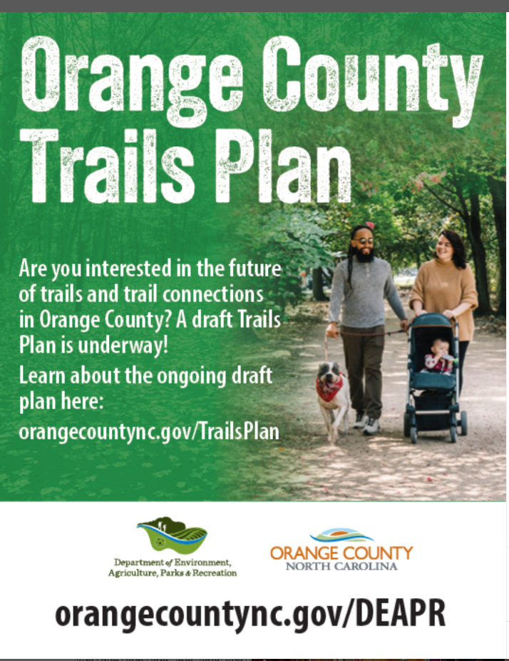The Orange County trails plan wants to improve connection throughout the county. "The plan is currently being developed through an analysis of existing conditions and trends, evaluation of existing plans and trail systems, outreach and engagement with community members, and other policies and initiatives." You can review it and give feedback on the website.