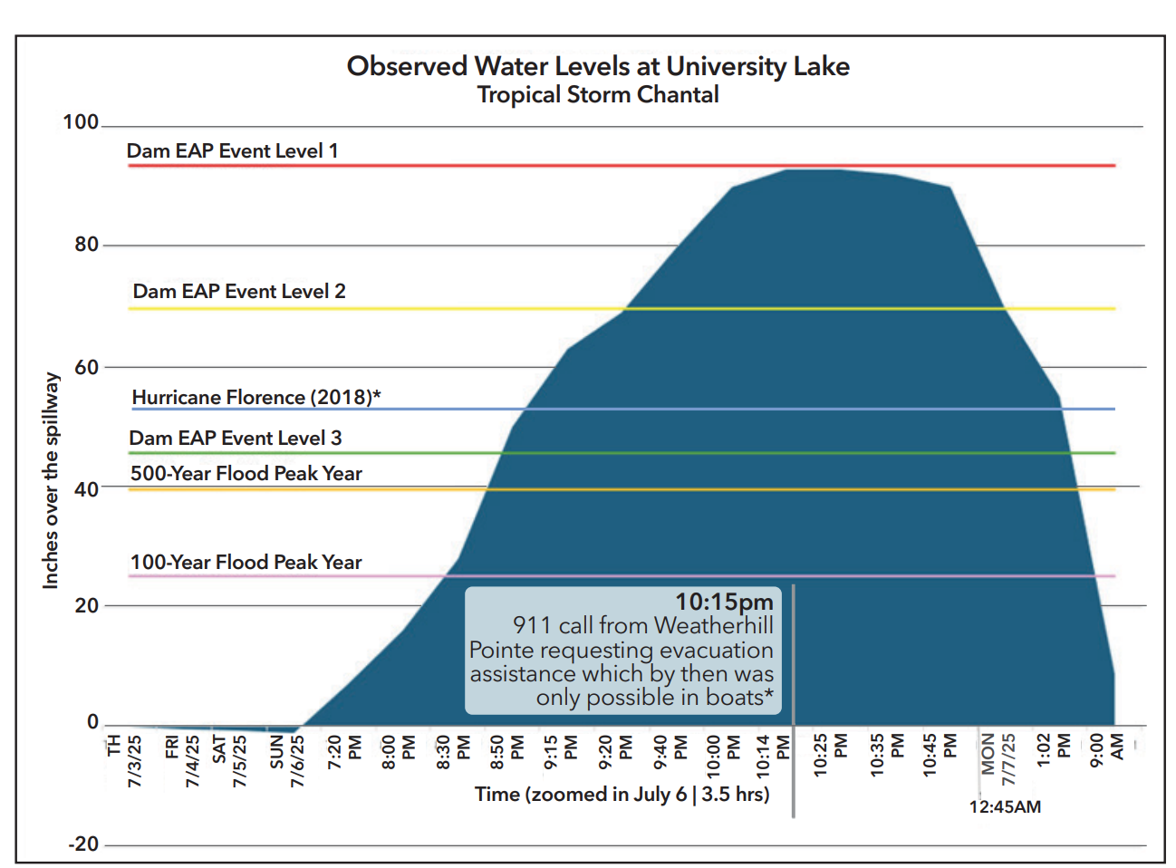 OWASA was in close and frequent communication with emergency responders throughout the storm regarding the rapidly rising lake levels. OWASA’s Dam Emergency Action Plan addresses dam failure risk against lake levels. It was not designed to use lake levels to predict downstream flooding.