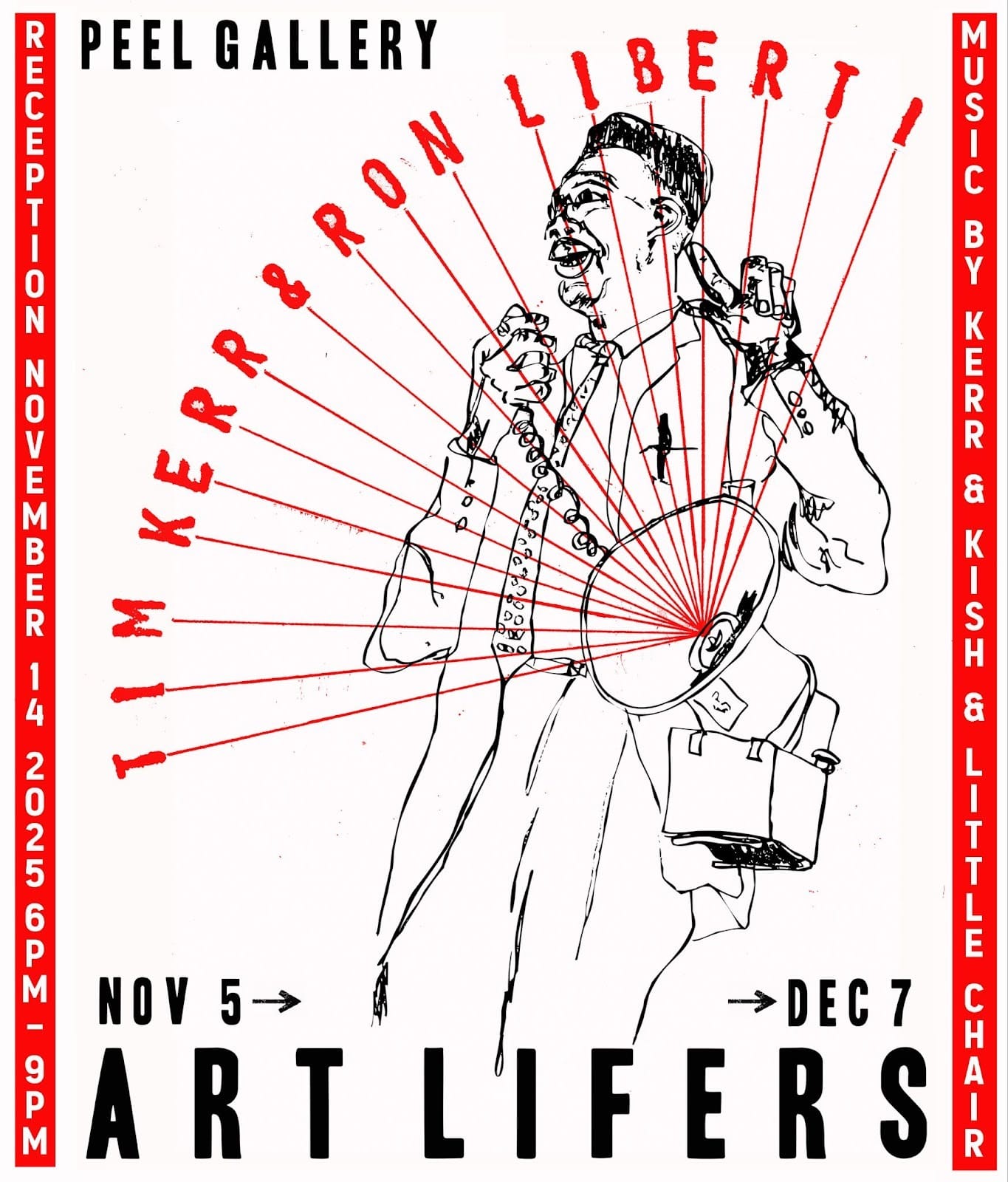 Peel Gallery 隆重推出 Art Lifers:蒂姆-科尔(Tim Kerr)和罗恩-利伯蒂(Ron Liberti)的绘画、版画和混合媒介作品,这是一次充满活力的双人展览,展出的是著名艺术家、音乐家的作品,他们的创作实践与地下文化和独立音乐交织在一起已有数十年之久。罗恩-利伯蒂(Ron Liberti)是北卡罗来纳州的视觉艺术家、丝网印刷商和音乐家,以其大胆的拼贴式演出海报而闻名,这些海报已成为三角地区独立音乐界和其他地区的标志性作品。 --Peel Gallery 新闻稿