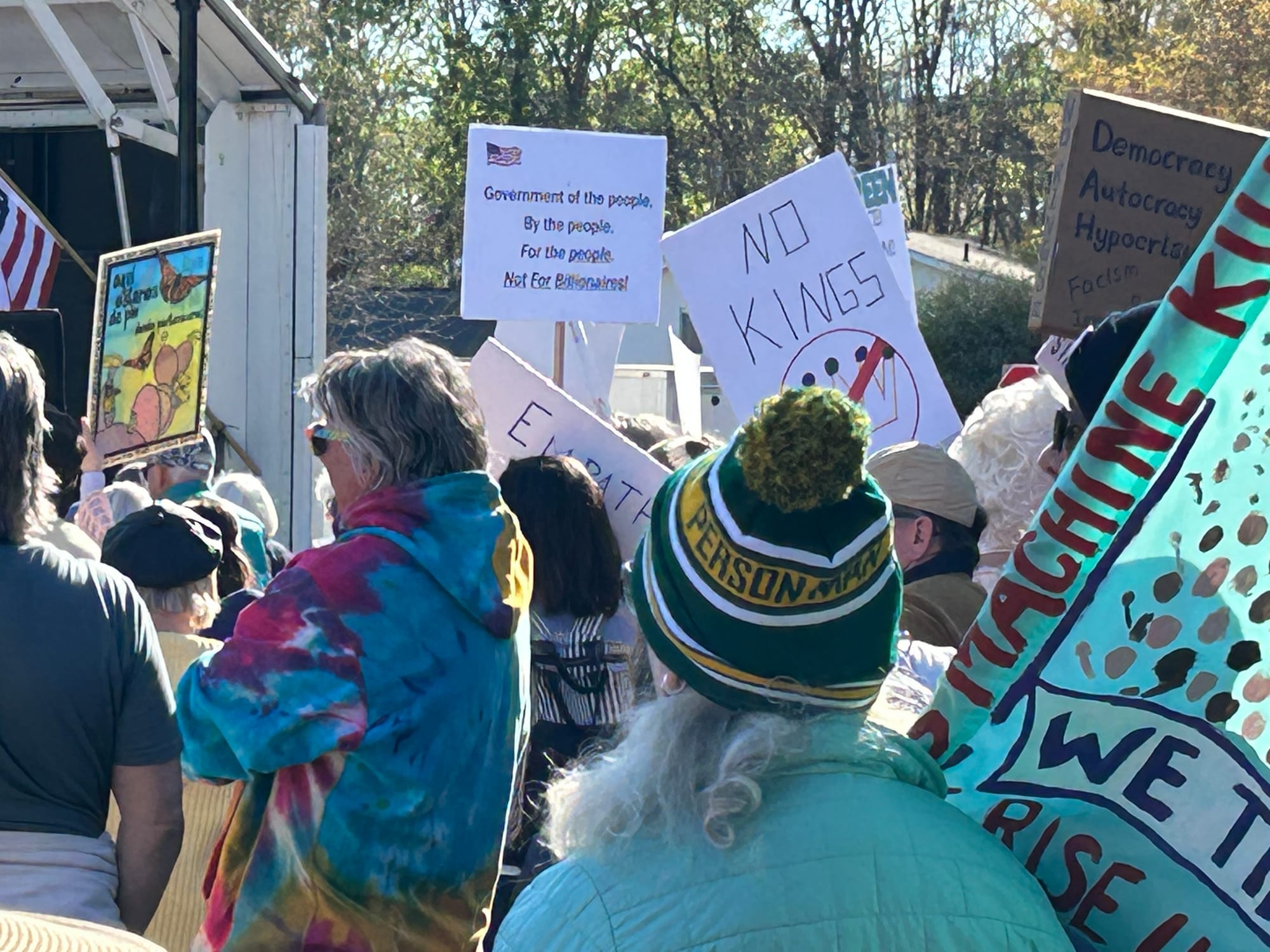 3月28日星期六下午3点左右,位于教堂山富兰克林西街140号的广场开始人满为患。到下午4点,成千上万的人聚集在一起,开始沿着富兰克林街向卡尔伯勒方向行进,他们手持美国国旗和写有 "支持美国,反对寡头"、"停止真理堕落 "和 "抛弃特朗普 "等字样的标语,这是 "无国王日 "集会的一部分。以 "无国王日 "为名的集会和抗议活动周六在三角地区和全国各地举行。